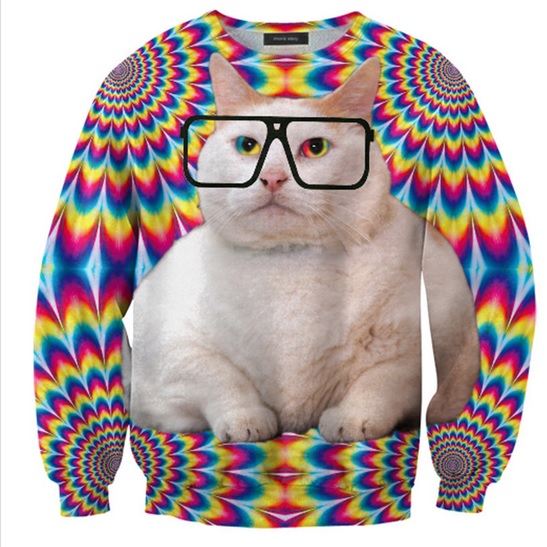 I won the “Fat Cat” sweatshirt and it is every bit as bizarre as this picture shows.  In fact; pictures do it NO justice.  Not only is it extremely vibrant, it is also very soft and comfortable.  I’ve bought screen printed tees in the past and they’ve often felt very stiff, especially where the screen printed photo was.  My sweatshirt from Lets Rage is all over screen printed, and is such high quality.  Alongside the Fat Cat, Lets Rage features a gamut of outlandish sweatshirts and tees featuring anything from Amanda Bynes to Scar from The Lion King.  If you want fashion forward pieces that scream, no, grab you by the balls and roar “life of the fucking party”, you definitely need one of these in your life. I definitely plan on wearing mine to the Steve Aoki concert next week (who ironically has the same sweatshirt).